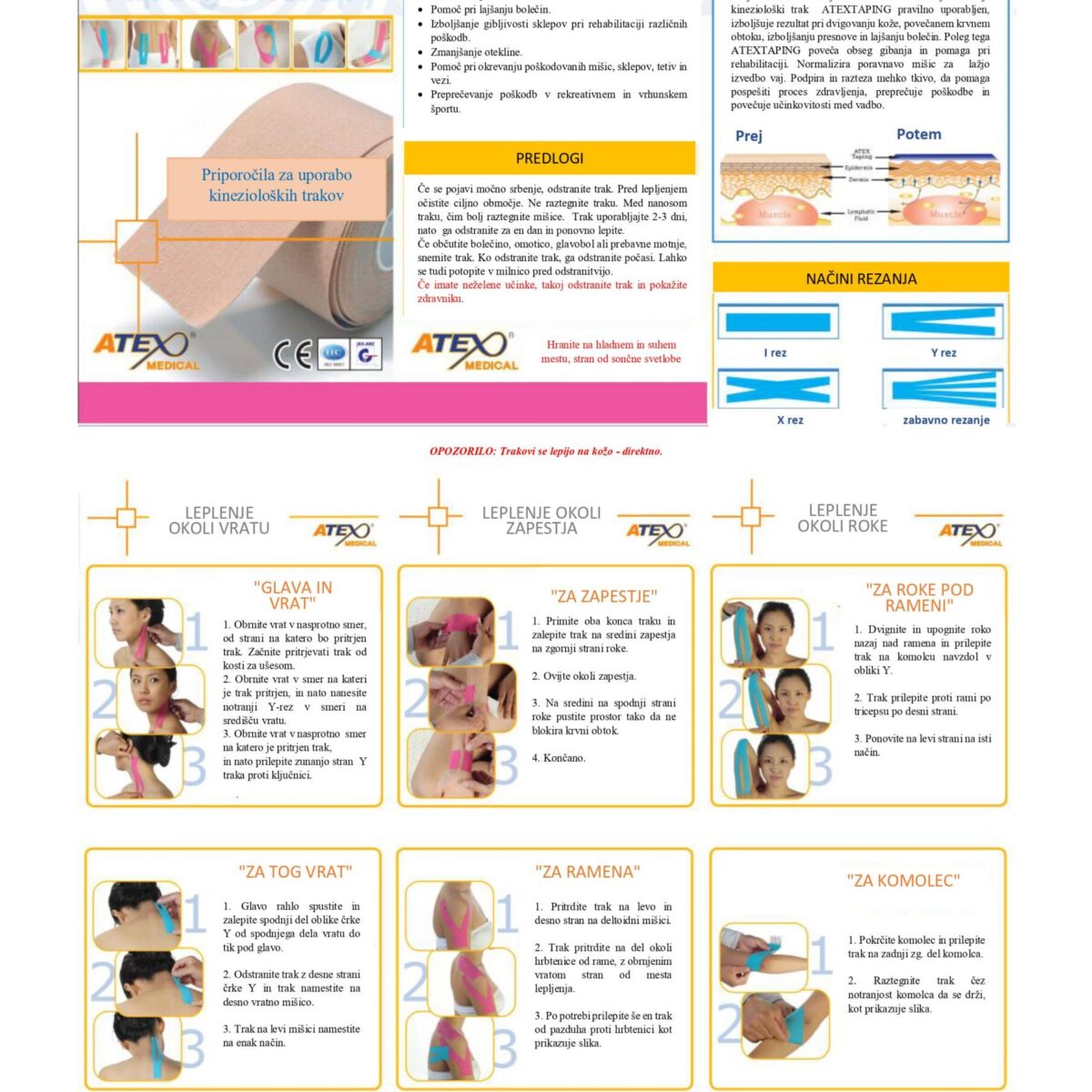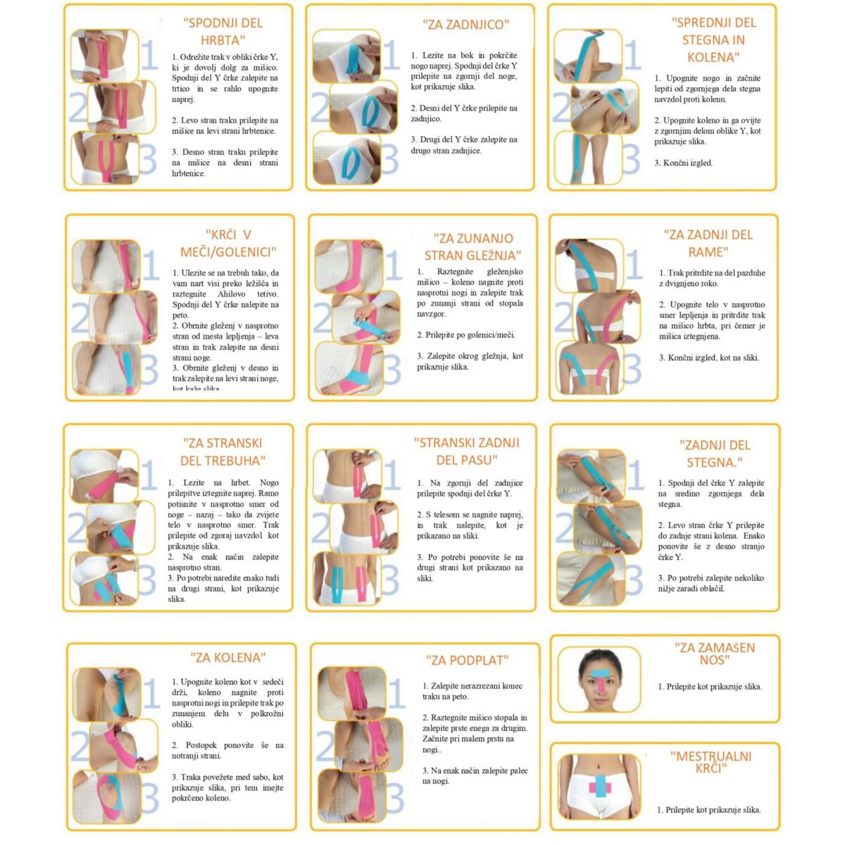 Priložena so slovenska navodila za osnovna leplenja kinezološkega traku.