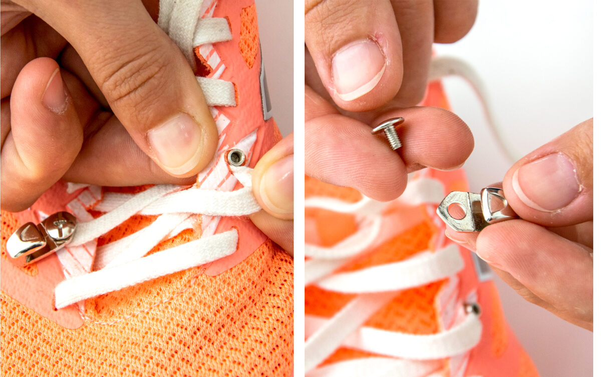 1️⃣ Vstavite zapiralo v luknjo za vezalke.